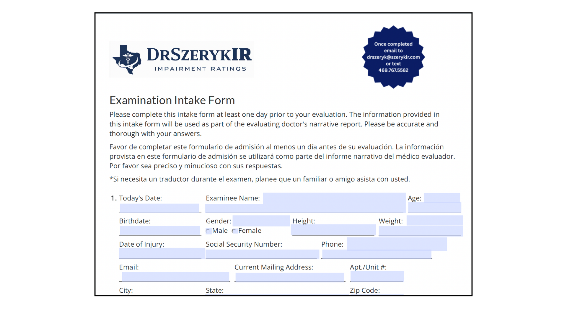 After scheduling, please complete the Intake Form and email or text the completed form to Dr. Szeryk prior to your appointment. This helps ensure your evaluation is efficient and thorough.